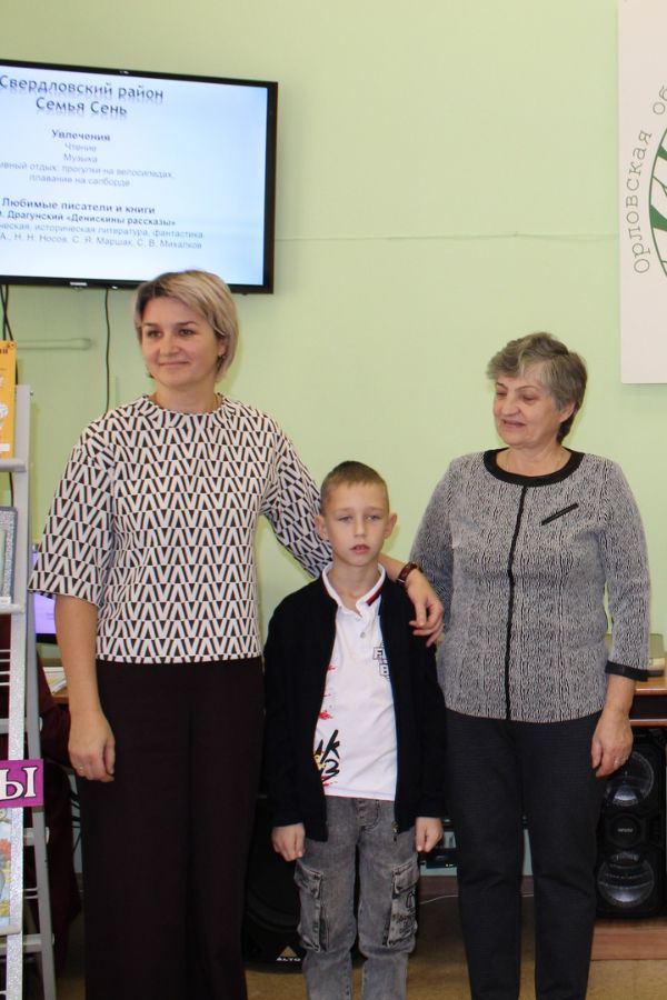 Свердловский район представила семья Вовы Сень, участники районного этапа областного фестиваля читающих семей "Библиотека плюс семья равно добрые друзья!". Они были награждены дипломами и подарками от областной детской библиотеки: комплектом книг для семейного чтения и сладкими угощениями.